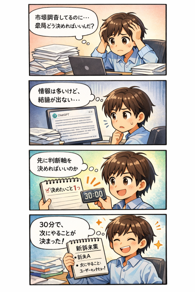 この記事では、ChatGPTを使って市場調査を「30分で意思決定に十分なレベルまで持っていく方法」を、実務手順として具体的に解説します。