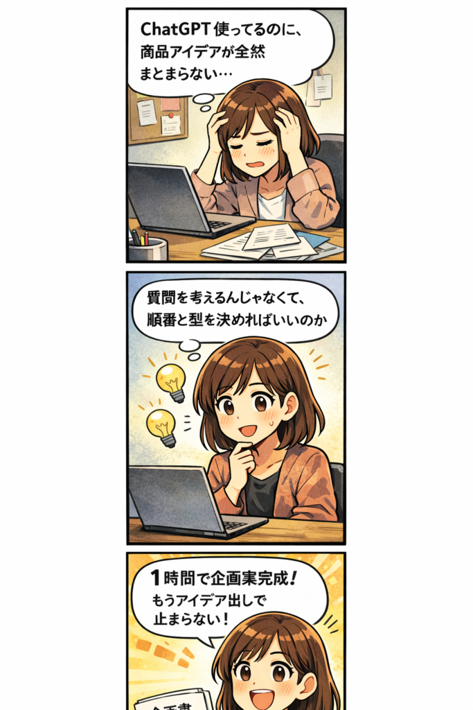 結論から言うと、ChatGPTでの商品企画は「質問の順番」を固定するだけで、スピードが一気に上がります。