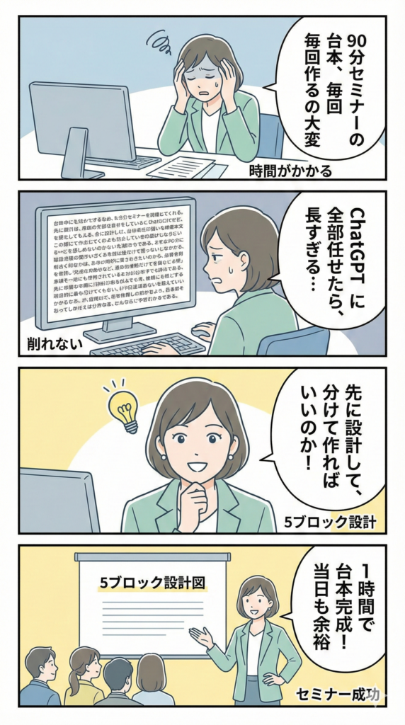 結論から言うと、90分セミナーは「5つの役割ブロック」に分解すると、台本設計の難易度が一気に下がります。