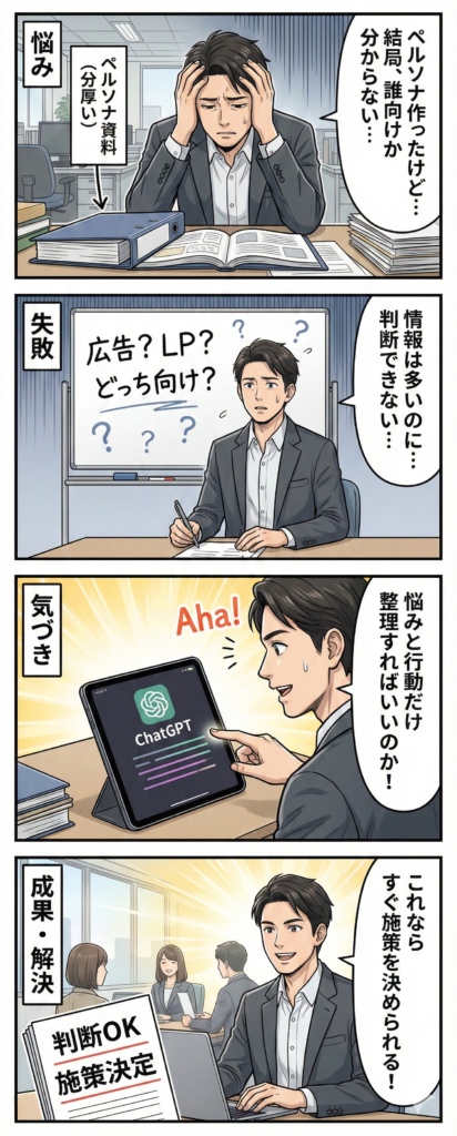 結論から言うと、ペルソナは1回作って終わりではなく、「判断テンプレ」として使い回すことで価値が出ます。