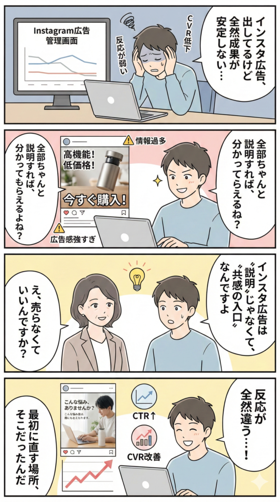 ●インスタ広告の役割は売ることではなく共感と興味づくりであり、説明や説得はLP側で行う分業設計がCV改善につながる