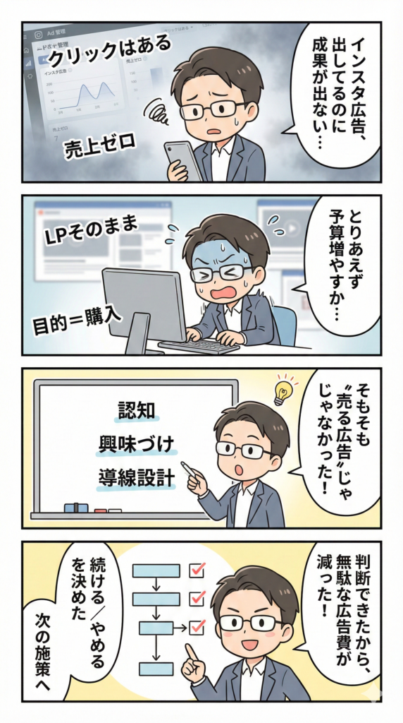 成果が出ているインスタ広告は、例外なく ①誰に → ②どんな感情を → ③どの行動へ の順で作られています。逆に失敗する広告は、商品やオファーから考え始めています。私の現場でも、この順番に変えただけでCVRが安定したケースは多いです。