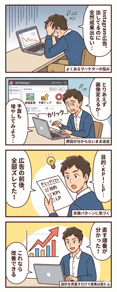 結論から言うと、Instagram広告の失敗原因の多くは「広告そのもの」ではなく、前後の設計ミスです。
