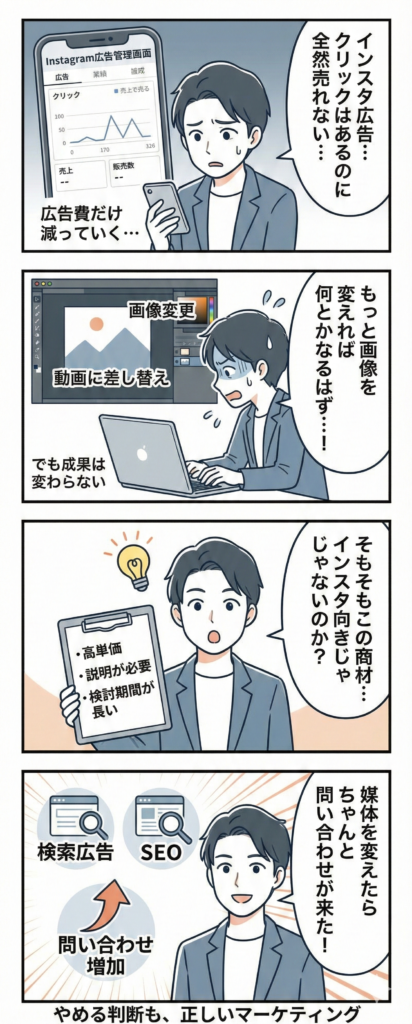 結論を先に言うと、「理解に時間がかかる」「今すぐ欲しい理由が弱い」商材ほど、インスタ広告とは相性が悪いです。