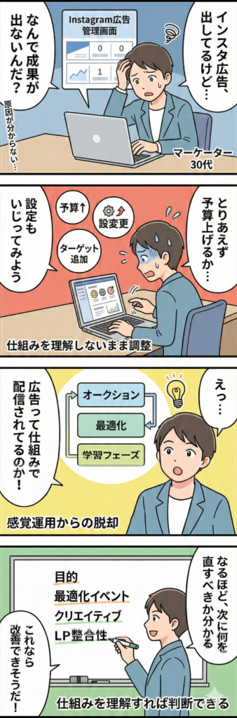 ●成果が出ないインスタ広告の多くは、目的選択・クリエイティブ・LP整合性など設計順のミスが原因である