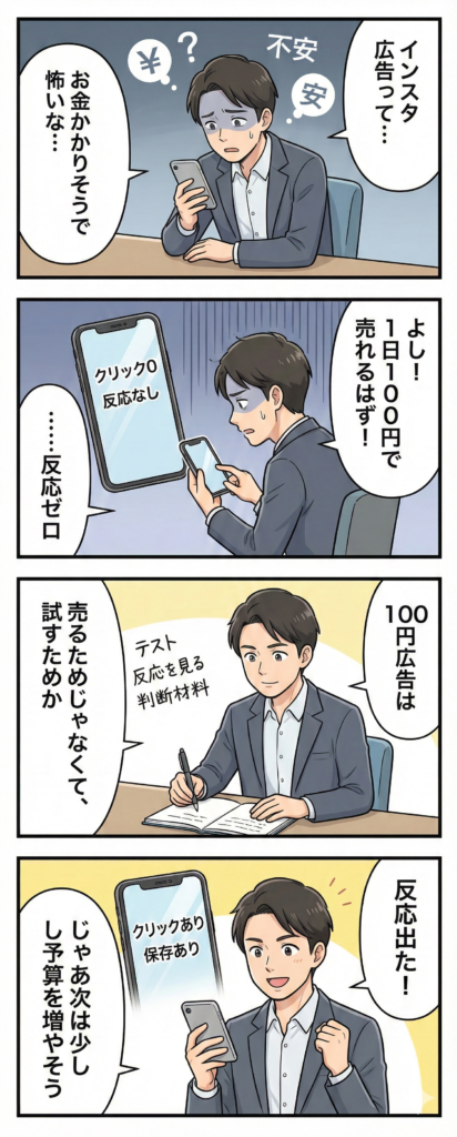 ● 1日100円広告では売上や問い合わせを狙うのではなく、配信の有無や反応の兆しを確認することが現実的な目的となる